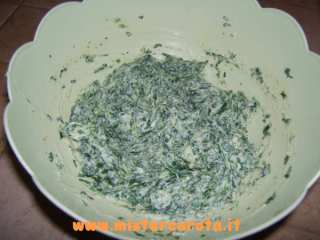 Li ho lasciati raffreddare, poi li ho tritati finemente, ho preparato il ripieno con ricotta freschissima di mucca (ma talmente buona che sembra di pecora!) spinaci, una grattata di noce moscata, una abbondante grattugiata di parmigiano, sale, pepe.