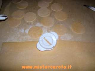Ho steso la sfoglia all'uovo sottile e poi ho ricavato dei cerchi con un bicchierino grandi quanto lo stampino, ho messo il cerchio di sfoglia sullo stampino infarinato,