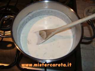 Ho preparato una salsa mettendo a scaldare 250 ml di panna da montare non zuccherata, vi ho fatto sciogliere 100 gr di gorgonzola, ho aggiunto circa 20-30 gr di farina per far addensare la salsa.