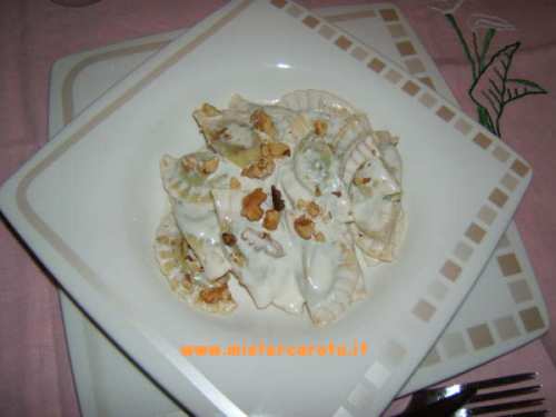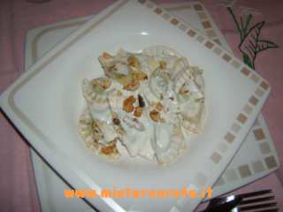 Li ho poi conditi con la salsa al gorgonzola, mescolato bene e sopra ho aggiunto le noci frantumate grossolanamente.