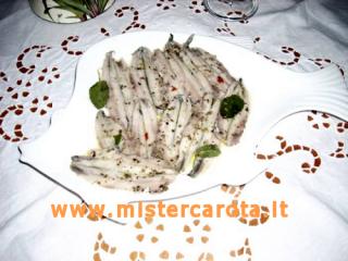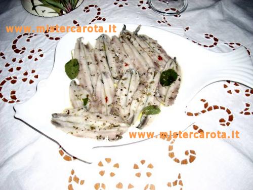 Ingredienti: alici freschissime - succo di 1 limone - aceto di vino bianco - olio extravergine d'oliva - 2 spicchi di aglio - un rametto di origano fresco (o alcuni pizzichi secco) - alcuni rametti di menta fresca - 2 foglie di alloro - 1 pizzico di peperoncino se vi piace piccante - una spolverata di pepe - sale q.b.