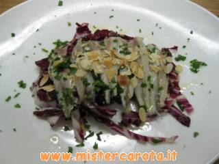 Tagliare a Julienne il radicchio, tostare le mandorle sfilettate in forno a 180 gradi per 15 min. circa.