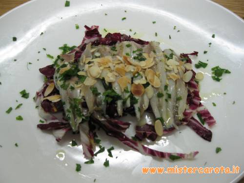Ingredienti: 500 gr. di alici - 100 gr di mandorle - un mazzetto di prezzemolo - 1 cespo di radicchio - aglio - olio - aceto - sale e pepe.