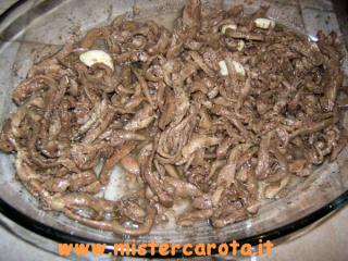 Sbucciare le melanzane, tagliarle a listarelle di circa 1/2 cm e raccoglierle in una grande pirofila, bagnarle bene con l'aceto di vino bianco e lasciarle marinare per 12 ore girandole ogni tanto anche con le mani per farle bagnare in maniera uniforme. Trascorso il tempo scolarle dall'aceto, strizzarle bene con le mani, raccogliere in un canovaccio pulito e torcerlo con forza per asciugarle ulteriormente, condirle con olio di semi, sale, origano e aglio pulito, lasciarle insaporire una notte intera.