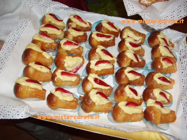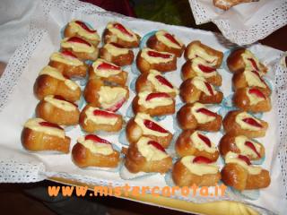 Preparate la crema pasticcera Preparate i bon-bon di babà come nella ricetta bon-bon di babà alla Strega Praticate un taglio sulla lunghezza dei babà e farciteli facendo uscire la crema pasticciera da una tasca da pasticciere con bocchetta rigata, decorate con fragole e lucidate con della gelatina.