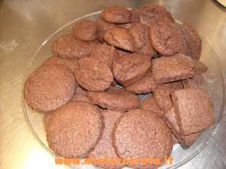 Miscelare le farine, il cacao lo zucchero e procedere come per una classica frolla. Lasciare a riposare per una mezz'ora. Spianare e tagliare i biscotti della forma che si desidera. Cuocere a 200°C. per 10-12 minuti. Nella foto si vede che i biscotti non sono tutti tondi, perché la pasta frolla la spiano una sola volta, poi riunisco i ritagli e ne faccio un salame che poi taglio a fette... cosi non devo aggiungere farina, faccio presto e la pasta frolla non indurisce nemmeno un po'.