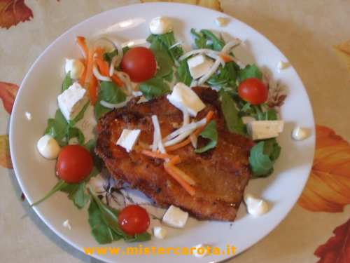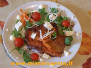 ingredienti per 1 porzione: 1/2 peperone rosso - 2 pomodorini - 50 gr di rucola - 25 gr di quartirolo - 25 gr di carota - 25 gr di sedano - olio per friggere - 1 uovo pangrattato - maionese.