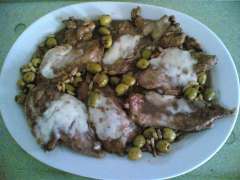 Ingredienti per 6 persone: 6 fettine di petto di pollo - 100 grammi d'olive verdi o nere denocciolate - 30 gr di pinoli toscani - 2 spicchi d'aglio - un ciuffetto di foglie di salvia - 2 fette di mortadella - 6 fettine di fontina - 3 cucchiai di farina - olio extravergine d'oliva - 1 bicchiere di buon vino rosso - sale q.b.