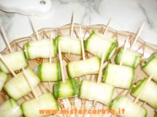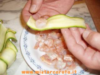 Prendere ogni singola fettina e metterci dentro un pezzo di gambero (non sciacquare le zucchine) e arrotolare per lungo.