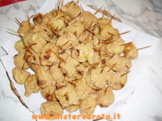 Passare i bocconcini nella pastella e friggere in abbondante olio molto caldo, reggendoli per circa un minuto dallo stuzzicadenti, poi si possono anche lasciare fino a cottura. Quando sono dorati, scolare su carta assorbente.