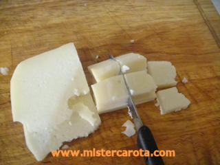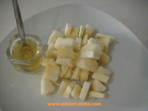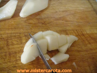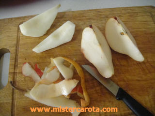 Ingredienti per 2 persone: 1 pera dolce e matura (william, abate...) - formaggio pecorino morbido, cioè semi-stagionato (in questa ricetta ho usato il Moro di Sardegna) - miele (facoltativo).