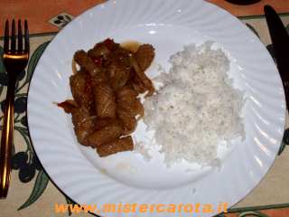 Ingredienti per 4-5 persone: 600 gr di calamari - 1 grande cipolla tagliata a spicchi - 1 cucchiaio di galanga (oppure zenzero) tritata - 3 spicchi di aglio tritati - 5 peperoncini senza semi affettati a rondelle - 3 cucchiai di salsa di soia dolce - 1 cucchiaio di salsa di pesce - 3 o 4 cucchiai di aceto di riso (oppure di aceto di vino bianco) - olio di semi.