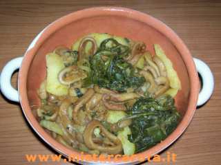 Ingredienti: 500 gr di calamari - 300 gr di bietole selvatiche - 200 gr di patate - 1 carota - 1 costa di sedano - 1 scalogno piccolo - 1 spicchio d'aglio - 3 cucchiai di olio extravergine d'oliva - vino bianco - 1 cucchiaio di concentrato di pomodoro - sale - pepe.