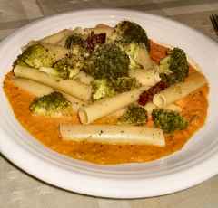 Scaldare brevemente il pesto di peperoni e coprire il fondo di ogni piatto su cui si metterà una porzione di pasta.