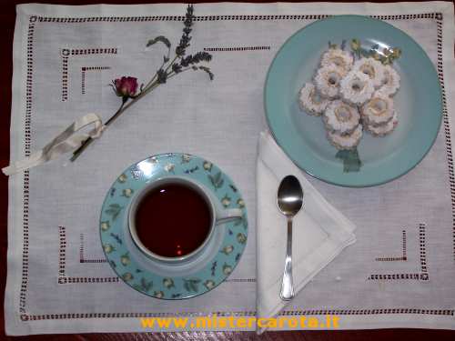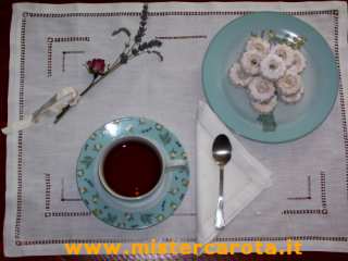 Ingredienti: 200 gr. di farina '00' - 100 gr. di fecola di patate - 180 gr. fi burro - 100 gr. di zucchero semolato - 2 tuorli - 1 cucchiaio di Vin Santo - zucchero a velo.