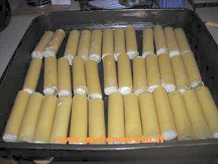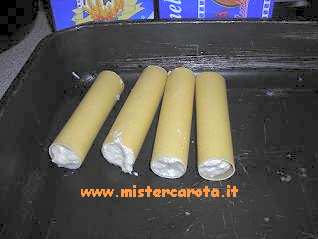 Riempio un po' il cannellone e poi infilo un pezzetto di provoletta (si può usare la provola fresca, la mozzarella... etc), riempio ancora, altra provoletta e finisco con il ripieno.