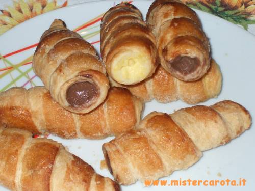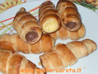 Ingredienti: 2 confezioni di pasta sfoglia - 6 o 8 coni di acciaio per cannoli - 500 gr di crema pasticcera - cacao dolce - zucchero a velo.
