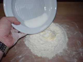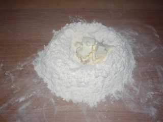 Mettiamo la farina setacciata a fontana sulla spianatoia, mettiamoci il burro a pezzetti,