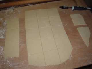 Tagliamo quindi la sfoglia a quadrati di 10 cm circa di lato e prepariamo accanto a noi un albume leggermente sbattuto.