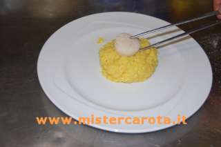 Ingredienti: cipolle - sedano - carote - 80 gr di midollo di bue - zafferano - 320 gr di riso vialone nano - vino bianco - capesante - brodo vegetale - zafferano - brandy - passata di pomodoro - sal?e - pepe - olio extravergine d'oliva
