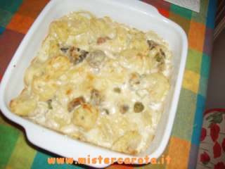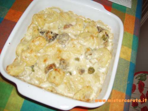 Ingredienti: cappelletti (o tortellini) - 1/2 cipolla - 150 gr di piselli - 300 gr di funghi misti (congelati) - olio extravergine d'oliva - sale - 1/4 di dado - 1 confezione di panna da cucina - 1 mozzarella - parmigiano grattugiato o pecorino.