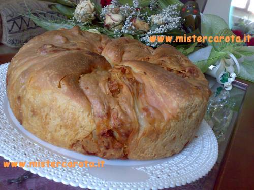Distribuite uniformemente il ripieno quindi arrotolate l'impasto tipo salame e man mano che lo girate, spalmatelo di strutto, una volta finito il rotolone tenetelo fermo da un lato e girate il lato opposto in modo da formare una grande treccia, richiudete i terminali e riponetelo nello stampo.
