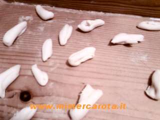 Prendete ciascun pezzetto e, con l'aiuto di un coltello dalla punta arrotondata, trascinatelo sulla spianatoia ottenendo così i cavatelli.