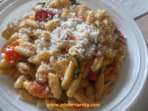 Ingredienti per 2 persone: 300 gr di cavatelli - 250 gr di pomodorini - 200 gr di rucola - 150 gr di ricotta salata - aglio - olio extravergine d'oliva - sale.