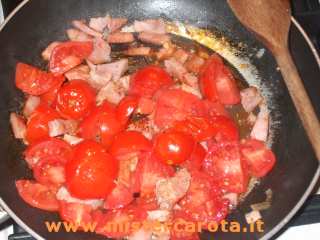 In una padella soffriggete della cipolla con lo speck ed il prosciutto cotto, aggiungete i pomodorini fate cuocere per 15 minuti.