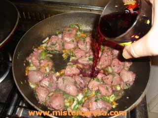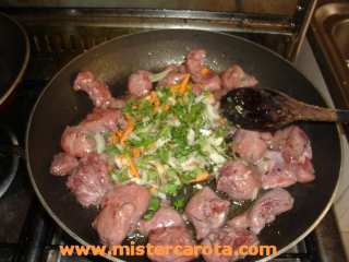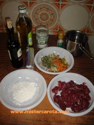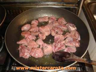 Scaldare la padella, spolverizzare la carne con un po' di farina, versare un po' d'olio nella padella e rosolare la carne tagliata a piccoli bocconcini