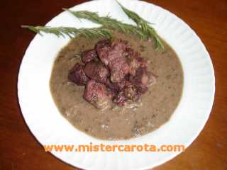 A fine cottura, far addensare la salsa, regolare sale e pepe, togliere i cubeti di carne e frullare la salsa di cottura. Aggiungere una noce di burro alla salsa si cottura. Servire mettendo la salsa a specchio, poi al centro i cubetti di carne e decorare con rametti di rosmarino.