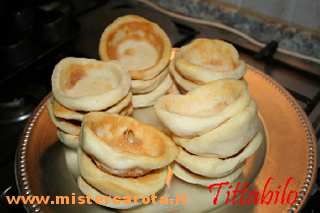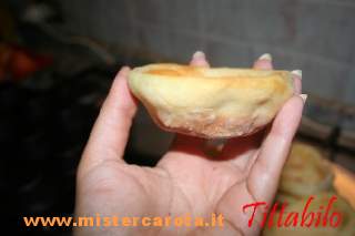 Si fa sciogliere il lievito in un po' di acqua tiepida con lo zucchero. Si mette la farina a fontana, si unisce il lievito sciolto, l'olio il latte e tanta acqua per ottenere un composto morbido. Infine si mette il sale, si fa lievitare un paio d'ore. Si stende con il matterello, se ne ricava dei dischi con un coppapasta o un semplice bicchiere e con i dischi ottenuti si riveste l'esterno degli stampi da muffin: in pratica si usa lo stampo al contrario. Si bucherella la pasta con la forchetta e si cuoce per 10 minuti a 200°C.