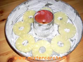Prendere lo stampo infarinato e distribuire sul fondo le fette di ananas spolverare con zucchero.