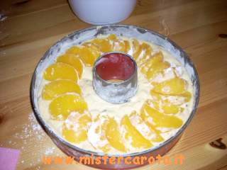 Le fette di ananas potete metterle anche sulla superficie alternandole con le mezze pesche.