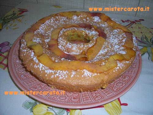 Ingredienti: 5 uova intere . un pizzico di sale; 300 gr di zucchero - scorza grattugiata di 1 limone o 1 bustina di vanillina - 1/2 bicchiere di olio di semi - 2 bicchierini di maraschino - 3 pesche non sciroppate - 350 gr di farina 00 - 1 bustina di lievito per dolci - zucchero a velo - le stesse bucce delle pesche ben lavate per la decorazione.
