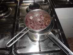 Iniziamo: scaldiamo a bagnomaria il cioccolato facendo in modo che non si scaldi eccessivamente, ossia arrivi a non piu' di 45-50 gradi C.; mentre inizia a fondersi lavoriamo il cioccolato con una paletta di metallo