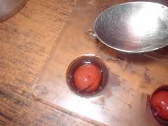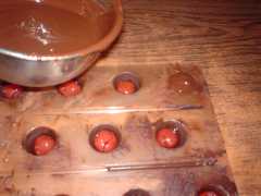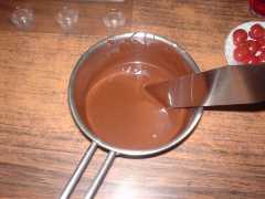 Intanto il cioccolato è sempre rimasto dentro il pentolino a bagnomaria ed a fuoco spento, vero? Bene allora versiamo sopra ogni ciliegia un po' di cioccolato fuso per tappare ogni "buco", avendo cura di non metterne ne' troppo ne' troppo poco