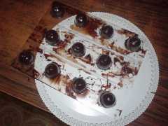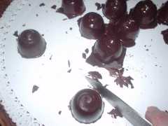Quando il cioccolato si è asciugato, mettiamo in ogni "buco" una ciliegia come ripieno