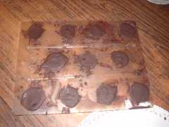 Con la paletta di metallo eliminiamo dalla superficie dello stampo le sbavature di cioccolato lasciando ogni "buco" libero e più o meno pulito.