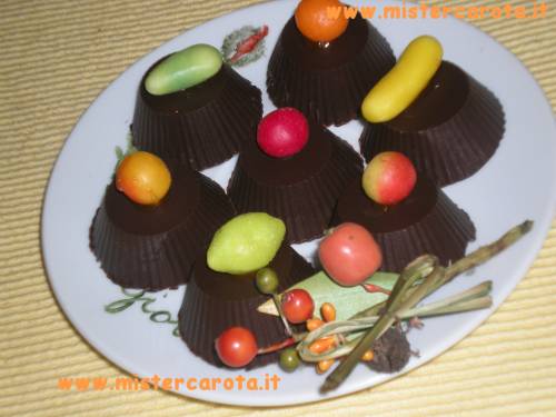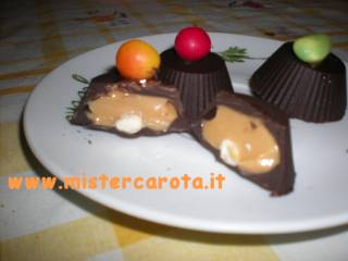 Per fare questi deliziosi cioccolatini ho usato gli stampini in silicone, quelli che si usano per fare i mini-muffin o altri dolcetti mignon. Li ho riempiti di cioccolato fuso, poi dopo una trentina di secondi, li ho capovolti per far cadere l'eccesso di cioccolato. Quindi ho lasciato che si rapprendesse bene indurendosi. All'interno ho messo un cucchiaino di Crema mou (ricetta del Forum MrCarota.it) e una mandorla. Poi ho coperto e chiuso la superficie con altro cioccolato. Li ho messi in frigo per un paio di ore, poi li ho tolti dai pirottini e li ho posizionati su un vassoio capovolti. Sopra ho messo delle caramelline per fare colore.