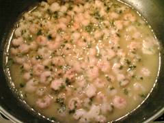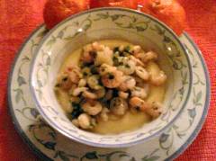 Ingredienti per due persone: 300 gr di gamberetti sgusciati (anche surgelati) - 2 clementine - 70 gr di burro - 1 spicchio di aglio pulito - 1 cucchiaio di prezzemolo tritato - un goccio di vino bianco secco - un pezzetto di dado da brodo - una puntina di peperoncino in polvere - pepe macinato fresco - polenta morbida.