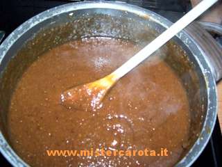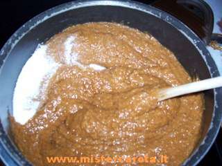 Pesare la polpa ottenuta e rimettere al fuoco con il baccello di vaniglia e una proporzione di zucchero pari a 900 gr per ogni Kg. di polpa.