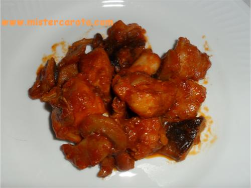 Ingredienti: 800 gr di coniglio disossato tagliato a pezzi - 400 gr di passata di pomodoro - 400 gr di funghi misti tagliati a pezzi - 1 cipolla tritata - 1 spicchio di aglio tritato - 2 foglie di alloro - 1 bicchiere di vino bianco - 1 cucchiaino di zucchero - 1 cucchiaino scarso di peperoncino in polvere - acqua - sale - olio q.b.