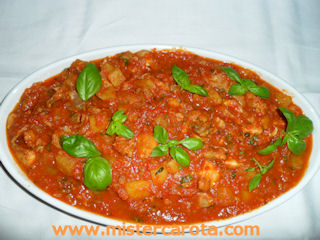 6. A cottura ultimata trasferite tutto sul piatto di portata e decoratelo con alcuni ciuffi di basilico.