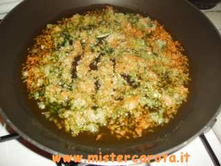 Tritare finemente tutti gli odori (abbondanti). Mettere a rosolare in padella con olio extravergine d'oliva e far appassire leggermente gli odori.