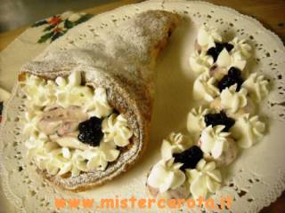 Ho riempito la cornucopia, che nel frattempo ho liberato dal cartoccio di cottura, ho decorato con la panna avanzata.