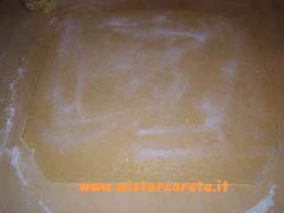 Tirare una sfoglia di 35x35 cm, spennellarla con burro fuso e cospargere su tutta la superficie lo zucchero semolato,