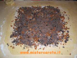 farcire la superficie con gli amaretti sbriciolati e il cioccolato fondente tritato col coltello.