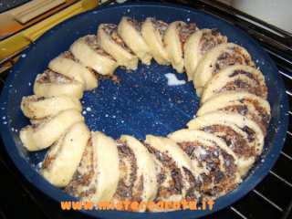disporre le fettine su una tortiera di 26 cm di diametro a corona sovrapponendole un pochino, io ho usato la tortiera al silicone... altrimenti foderare con carta da forno.