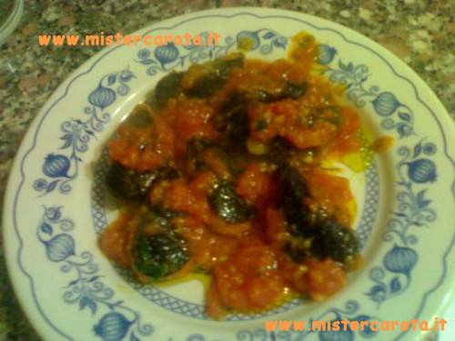 Appena il sugo comincia a restringersi mettete dentro le cozze, portate a cottura allungando con un po' di liquido di cottura delle cozze, fate restringere, spolverizzate di prezzemolo e servite ancora calde.